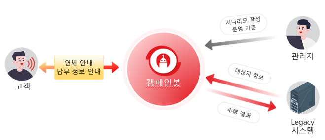 캠페인봇은 만족도 조사, 방문예약 확인, 설문 조사 등의 캠페인 업무에 적용되는 솔루션으로 캠페인 대상으로 등록된 고객에게 전화를 걸어, 통화 연결된 고객과 AI 상담사가 대화를 통해 서비스를 제공합니다.